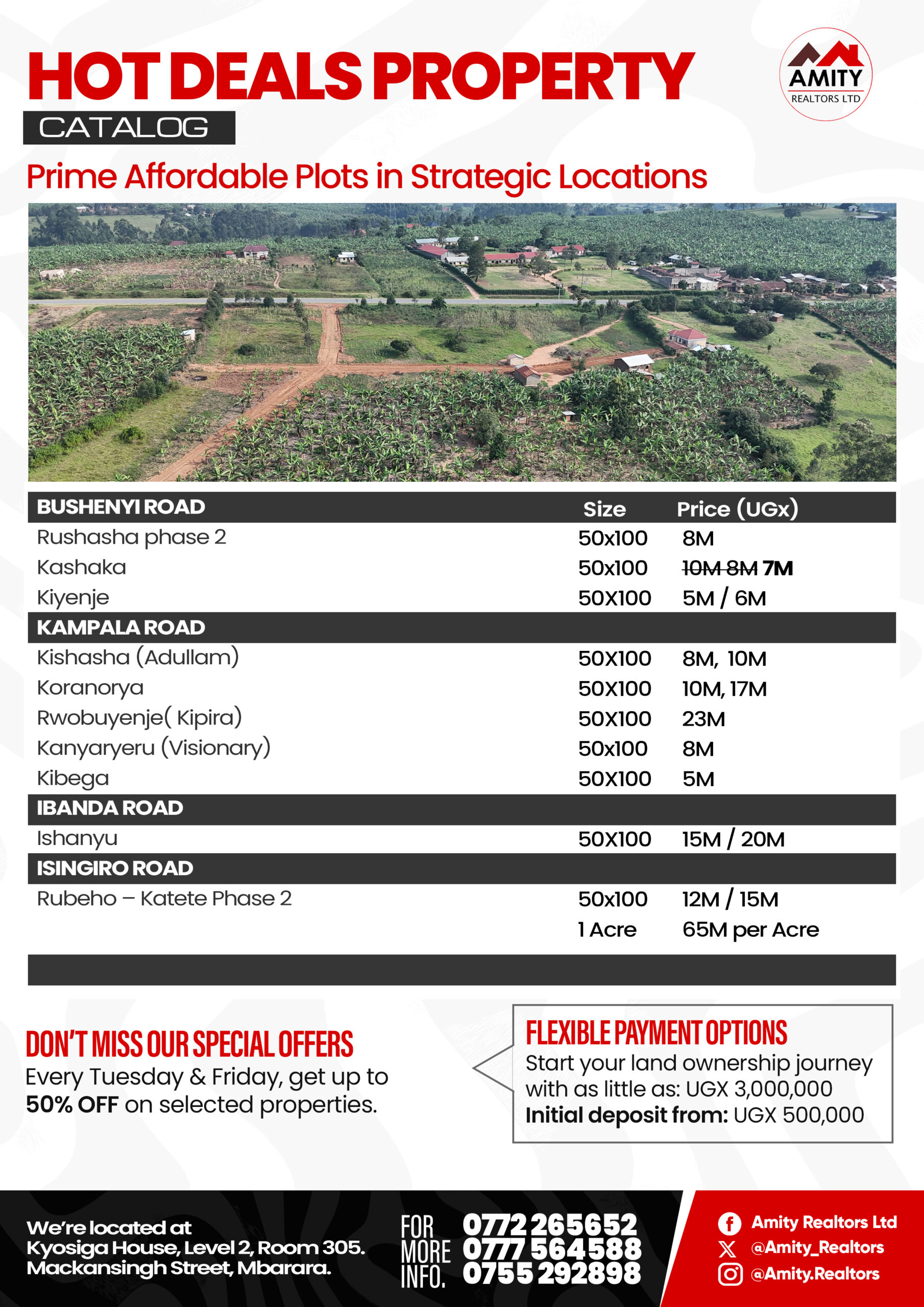 If you’ve been waiting for the right moment to invest in land, this is it. Amity Realtors Ltd has rolled out a powerful property catalog featuring affordable plots in fast-growing, strategic locations perfect for building, farming, or long-term investment.