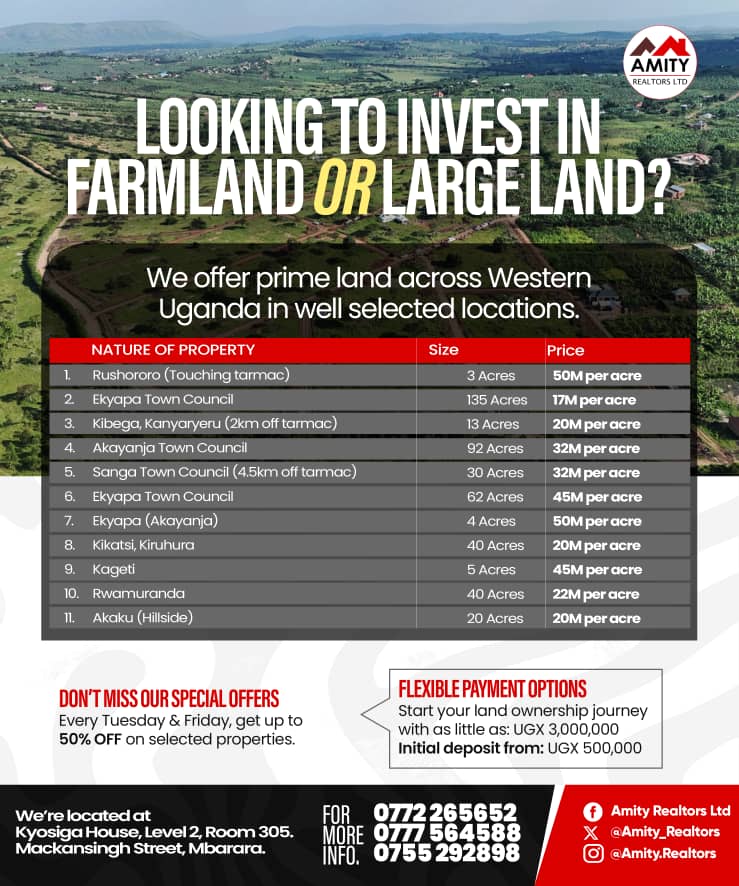 Are you looking to invest in farmland or large-scale land with real value and growth potential? Amity Realtors Ltd is offering a range of prime land opportunities across Western Uganda, carefully selected to suit both investors and agricultural entrepreneurs.