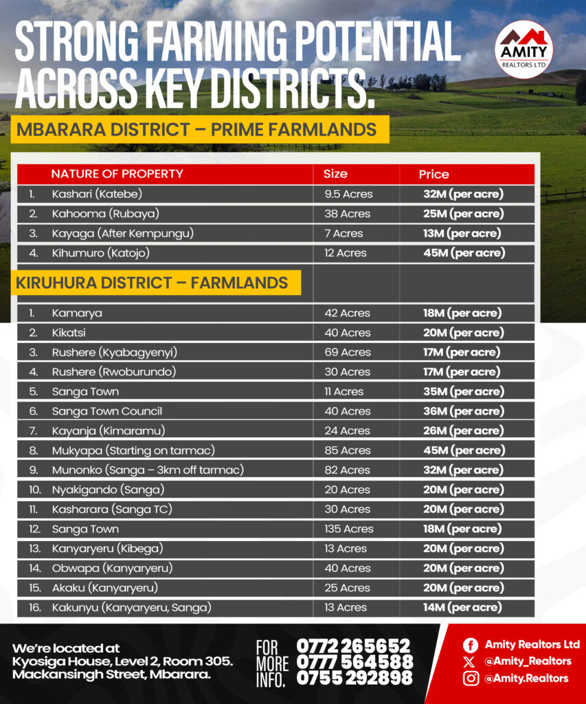 Land in Western Uganda continues to prove itself as a high-return investment, especially in agriculture. Whether you’re a first-time buyer or an experienced investor, the farmlands in Mbarara and Kiruhura offer a rare combination of affordability, productivity, and growth potential.